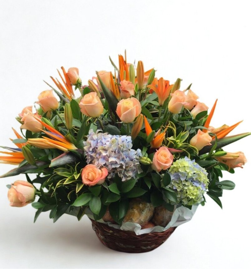 Canasto frutero en rosas, aves de paraíso, hortensias y frutas.
